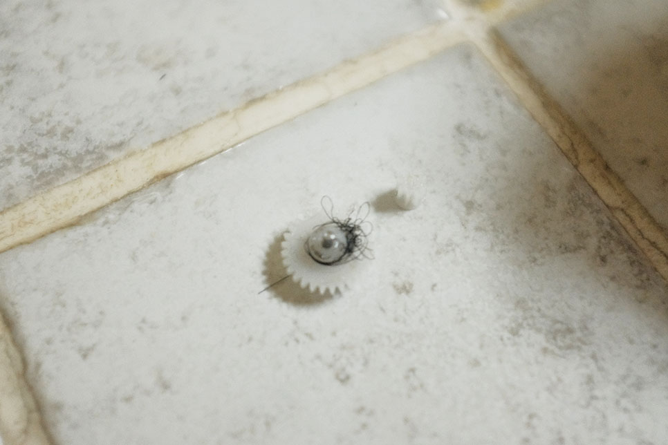 깔깔, 끊어진 머리카락이 뒹굴고 흘러나온 윤활제 같은거에 먼지가 덕지덕지 붙어있어서 매우 더럽다.